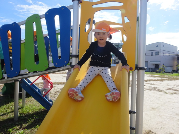 - お山の滑り台、石を持って一人で登れたよ。ドキドキしたけど何回も滑って楽しかった♪