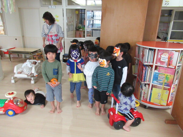 - 「ぴかぶ〜」と可愛いお化けが各クラスへ遊びに来ました。小さいクラスの子に優しいお化けでした。