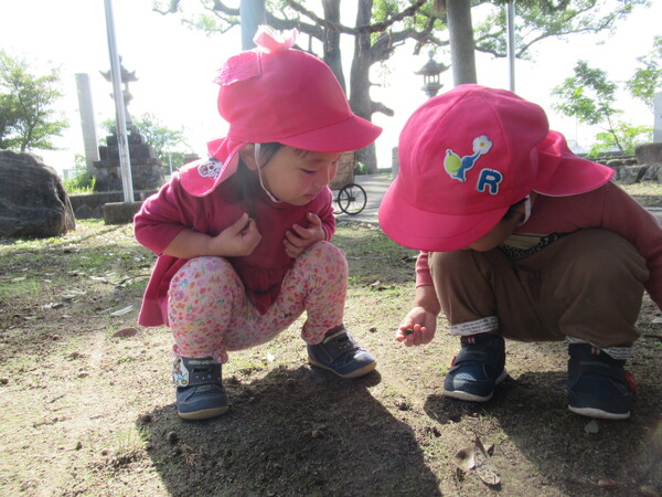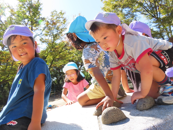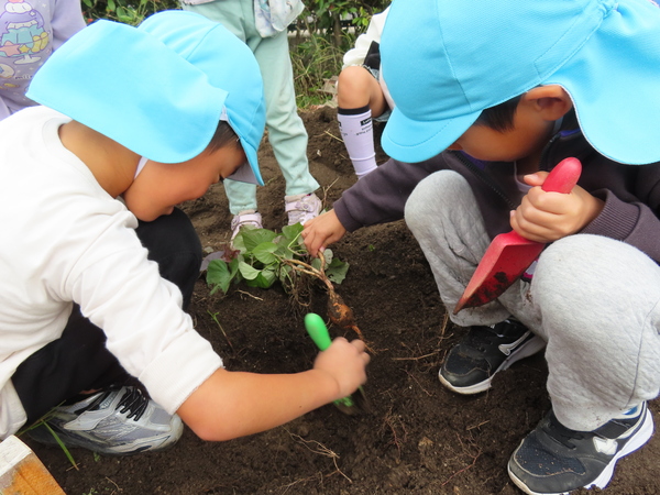 - 園庭の畑のお芋を掘ったよ。なかなか見つけられなかったけど、お芋が自分で掘れて嬉しかったよ。