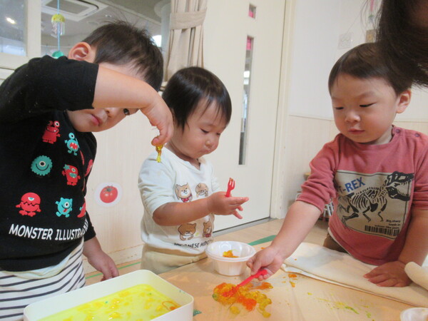 - 不思議な触り心地♪スプーンで混ぜ混ぜしたり、手ですくったりしたよ!
