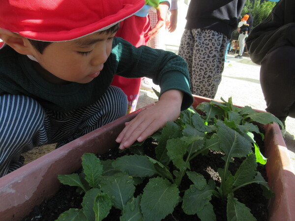 - 食育の一環で野菜を育てています。何の種かナイショで植えたお野菜。おててくらい大きくなったよ。根元が白いね、大根かな?これからオレンジになって人参かも!さて、なにが育つでしょうか♪