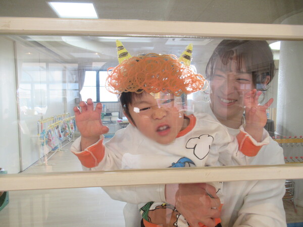 見てみて!窓を覗いたら鬼に変身!表情も変えてみたけど、鬼に見えるかな?
