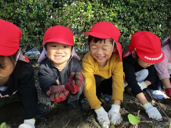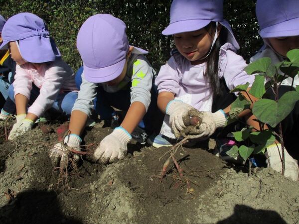 | 子どもたちが植えたさつまいもの苗が成長し、収穫時期を迎えたので芋掘りをしました。 毎日「今日は芋掘りの日?」と保育士に質問する程楽しみにしていた子どもたち。 土を掘り進め、さつまいもが出てきた時には「あった〜!」と嬉しそうにしていました。その後、つるを使って電車ごっこをしたり、大繩に見立てたりして遊びました♪ |