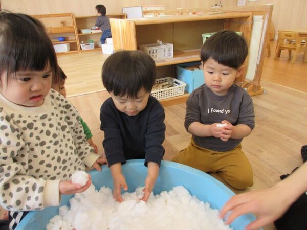 新聞紙あそびをしました!指先でつまんだり、ダイナミックに引っ張って破ったりなど、新聞紙の匂いや感触を楽しみながら遊んでいきました。ちぎったものを集めて、保育士が上から雨のように降らせると「わぁ〜!」「もう一回!」と嬉しそうにする子どもたちでした。 |