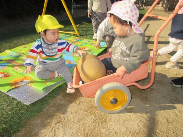 暖かい日に園庭で遊びました。もも組のお兄さんお姉さんと一緒にシャボン玉を追かけたり、砂を手で触ったりスコップですくって楽しみました。 |