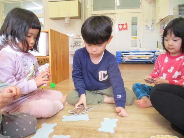 ぐりとぐらさんの部屋に遊びに行きました。初めて見る玩具に興味津々の子どもたち。「これなあに?」と言いながら楽しそうに取り組んでいました。 |