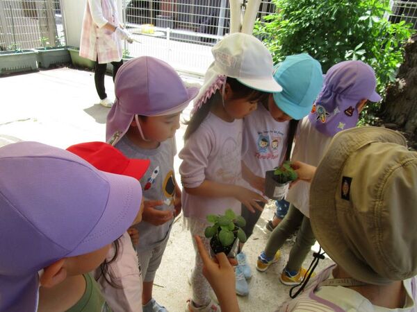 夏野菜を収穫しました。収穫した野菜を触ってみたり、においを嗅いでみたり、みんなで塩もみをして食べました。また、野菜スタンプにして断面を観察しながら制作も楽しみました。 |